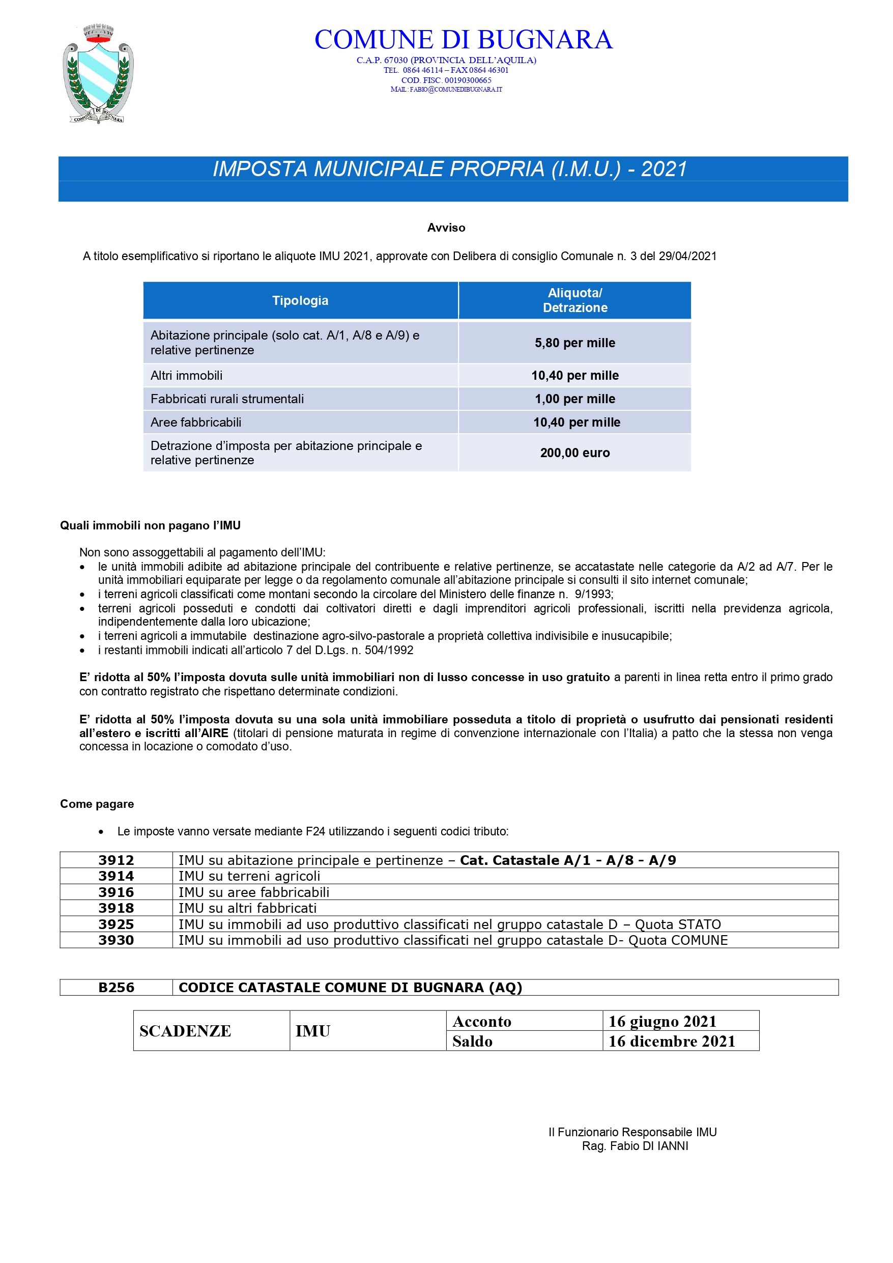 Avvisi e Notizie 22 Maggio 2021 IMPOSTA MUNICIPALE PROPRIA (I.M.U.) – 2021 Posted By: admin 1692 Visualizzazioni