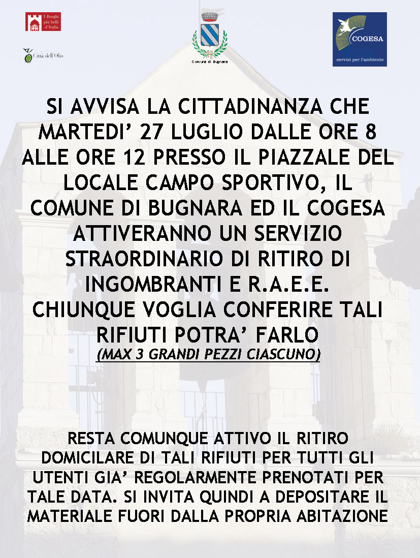 Avvisi e Notizie 22 Luglio 202122 Luglio 2021 SERVIZIO STRAORDINARIO DI RITIRO DI INGOMBRANTI E R.A.E.E. – MARTEDI’ 27 LUGLIO Posted By: admin 1241 Visualizzazioni