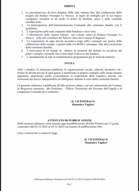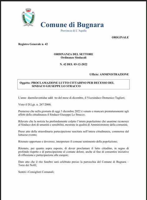 Proclamazione di lutto cittadino dalla data del 3 dicembre 2022 fino alla celebrazione delle esequie del Sindaco Giuseppe Lo Stracco, in segno di cordoglio per la sua tragica scomparsa. Ci si unisce in tal modo al dolore di familiari, amici e della comunità cittadina tutta.