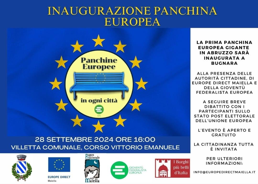 Sabato 28 Settembre 2024 alle ore 16.00 nei pressi della Villetta Comunale (ingresso Bugnara proveniente da Sulmona) verrà inaugurata la prima Panchina Europea gigante in Abruzzo alla presenza delle autorità cittadine, di Europe Direct Majella e della Gioventù Federalista Europea.
